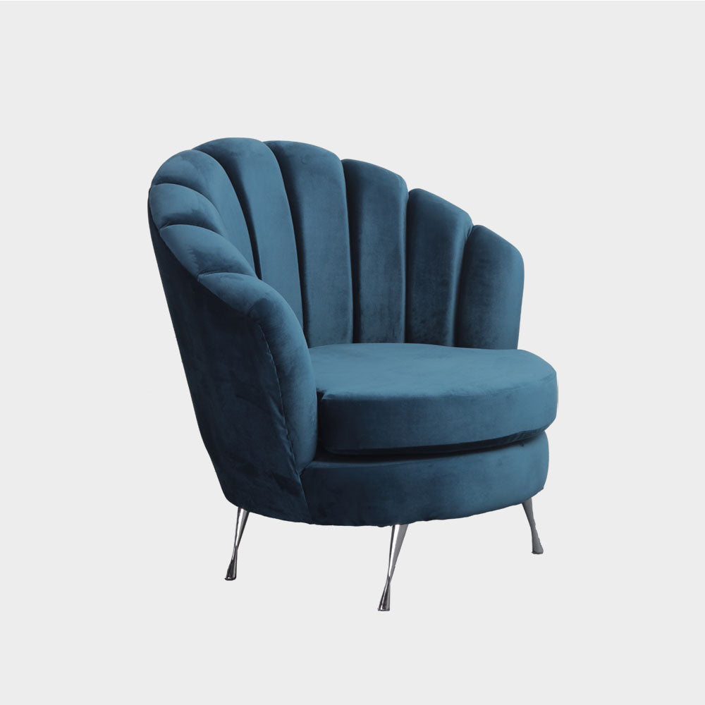 A Classic shell inspired accent chair upholstered in malaysian suede padded with uratex foam and has stainless steel legs.Size: L100xW85xH91 cm