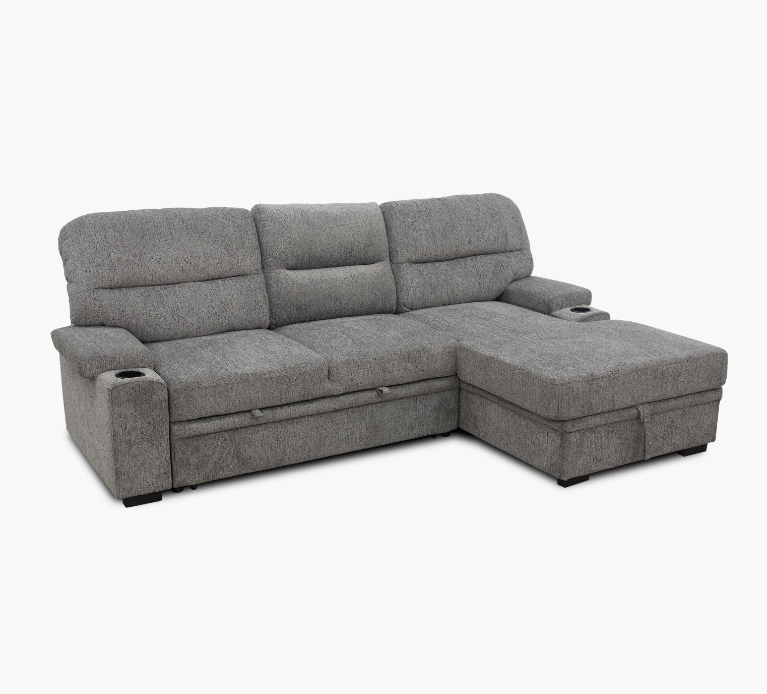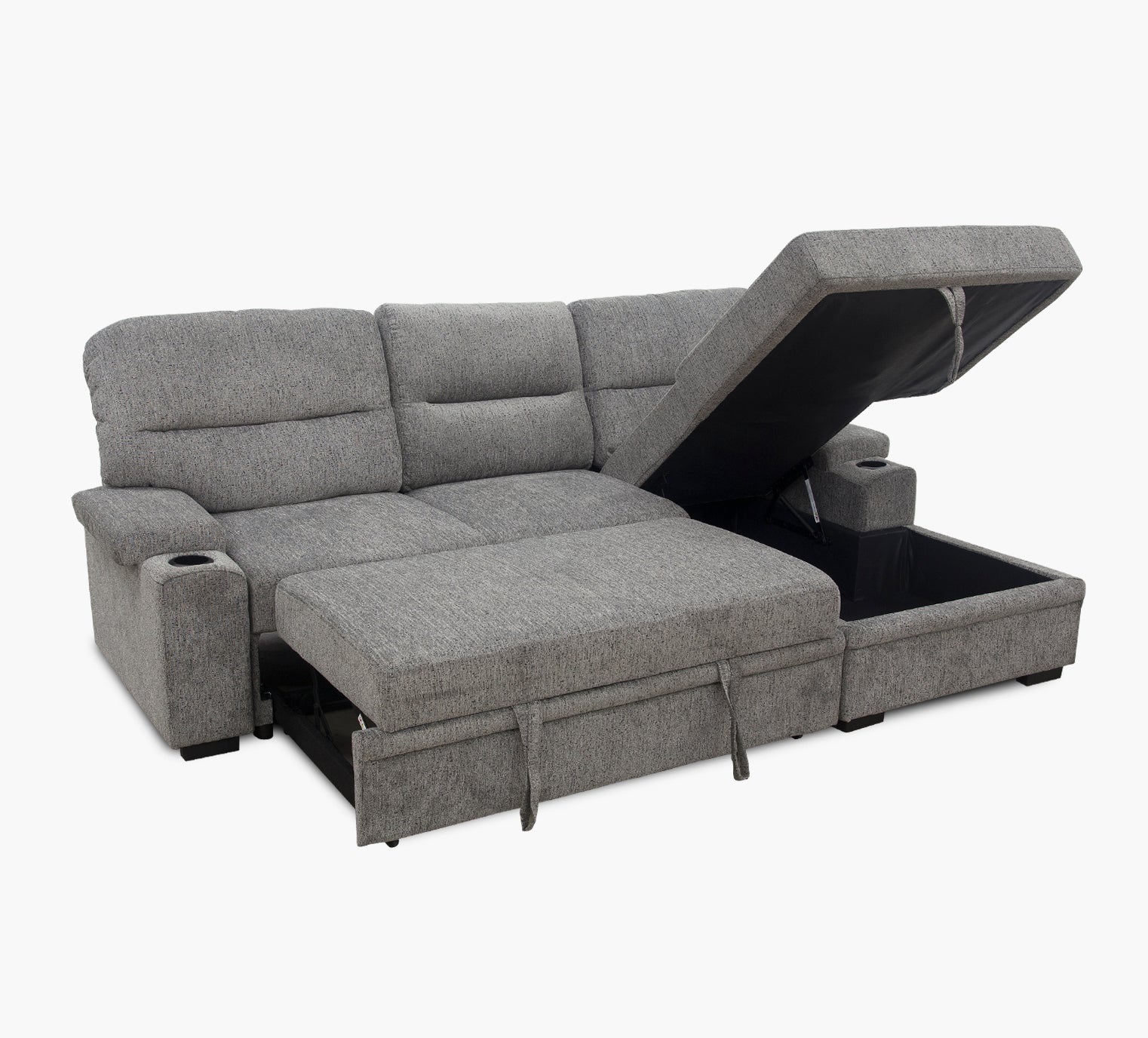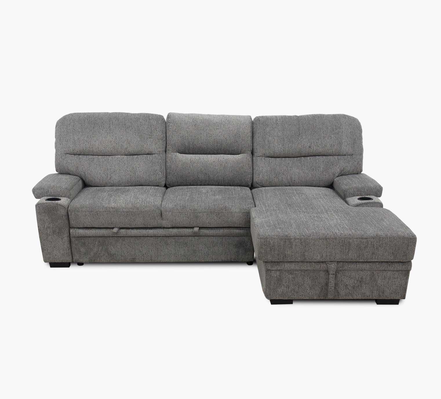 休闲现代 2 件组合式家具,配有可拉出的脚凳床和隐藏式储物空间。卧铺部分采用灰色织物装饰,配有蓬松柔软的靠垫和带耐用泡沫的弹性座椅。每个扶手上都有一个杯架,躺椅座垫下有隐藏式储物空间。整体尺寸如图所示:101″ x 64″