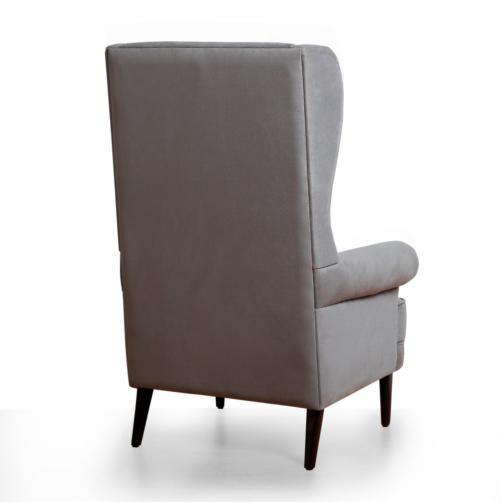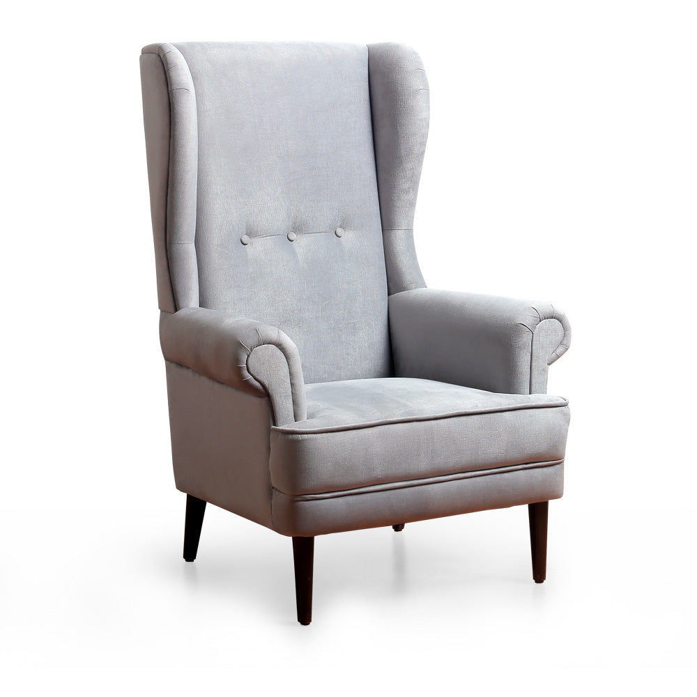 A Classic style accent chair with high wing back and rolled armrests and button tufting detail, fully padded and upholstered in fabric with solid wood legs.Size: L70xW86xH120 cmWeight capacity: 130 kg